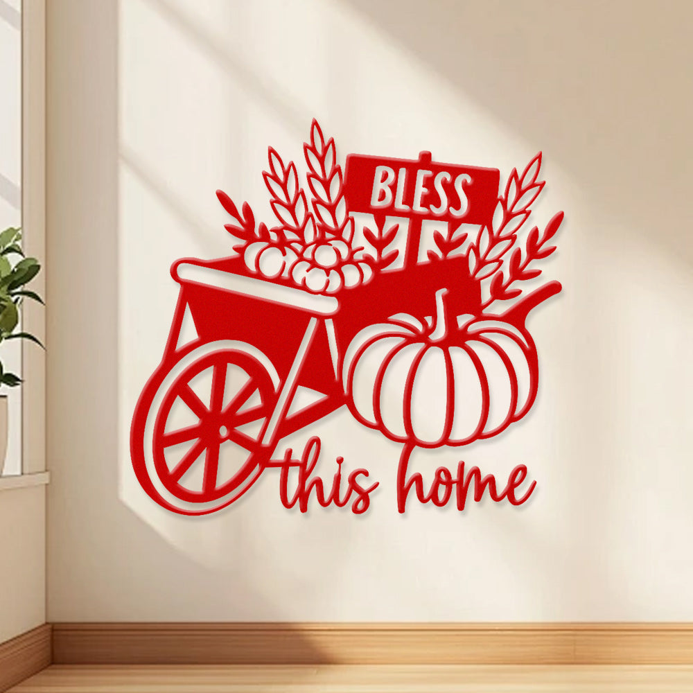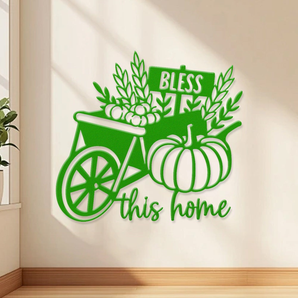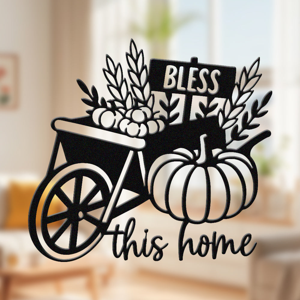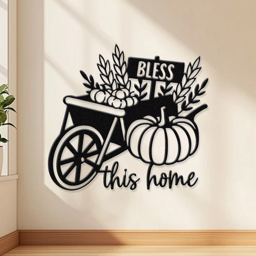 Bénis Cette Maison Métal Décoratif Mural - Décor en Fer Citrouille et Brouette