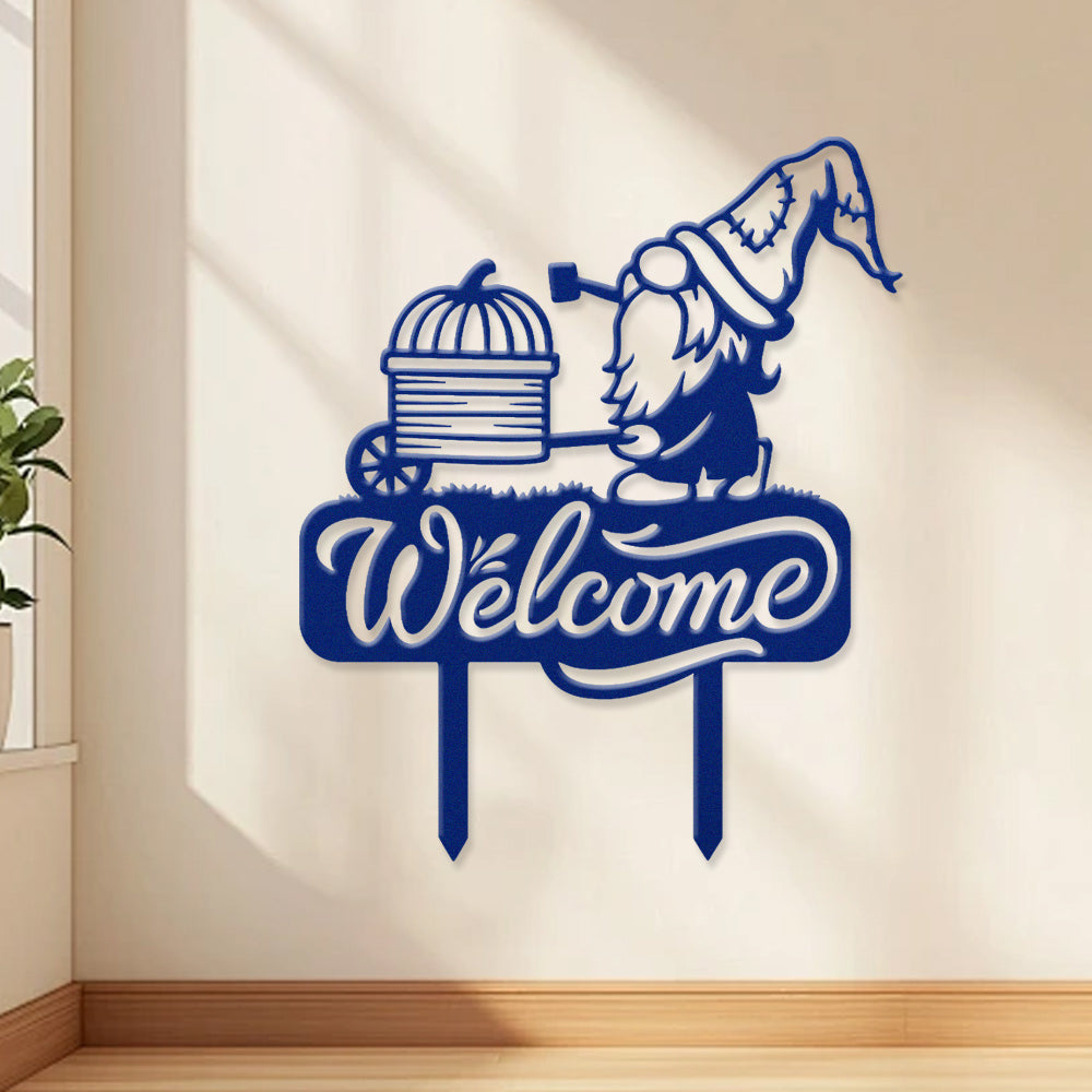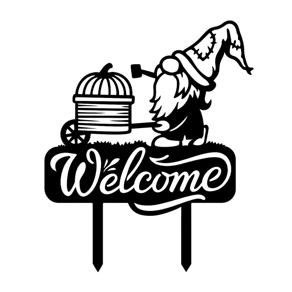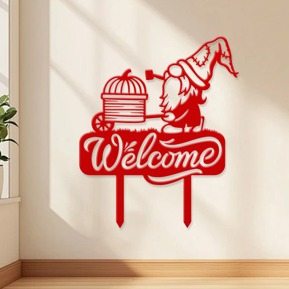 Bienvenue Métal Décoratif Mural - Décor en Fer Gnome avec Chariot à Citrouille