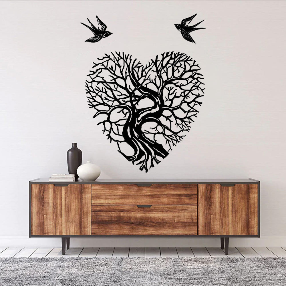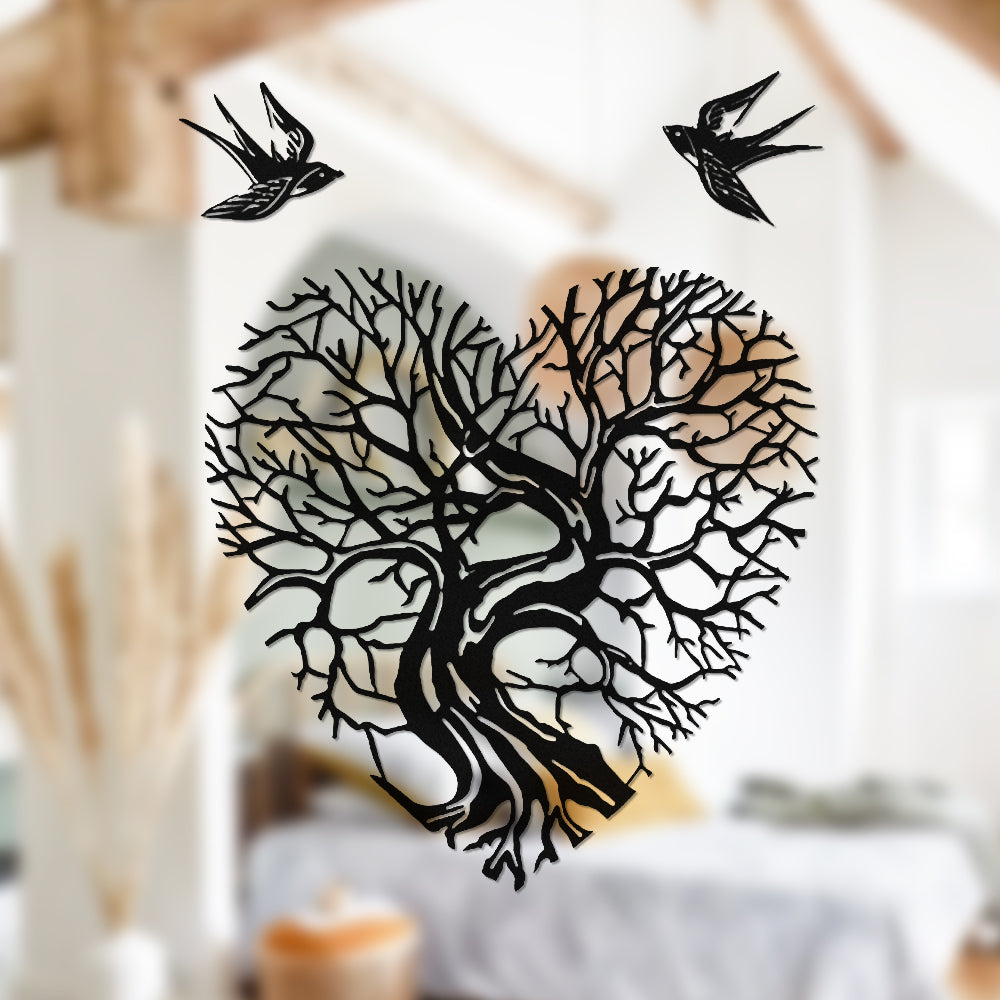 Oiseaux et Arbre de la Vie en Forme de Cœur Art Mural en Métal