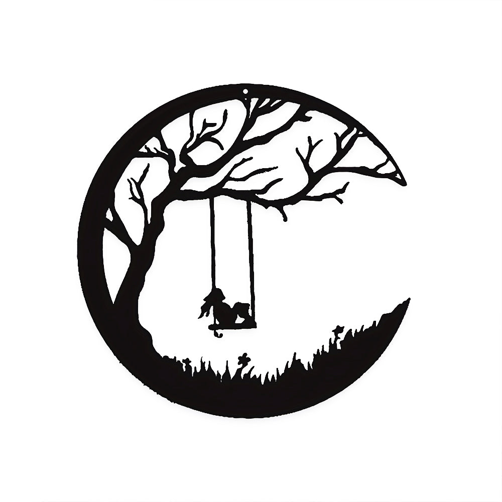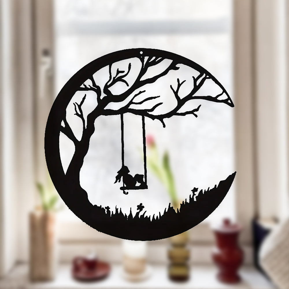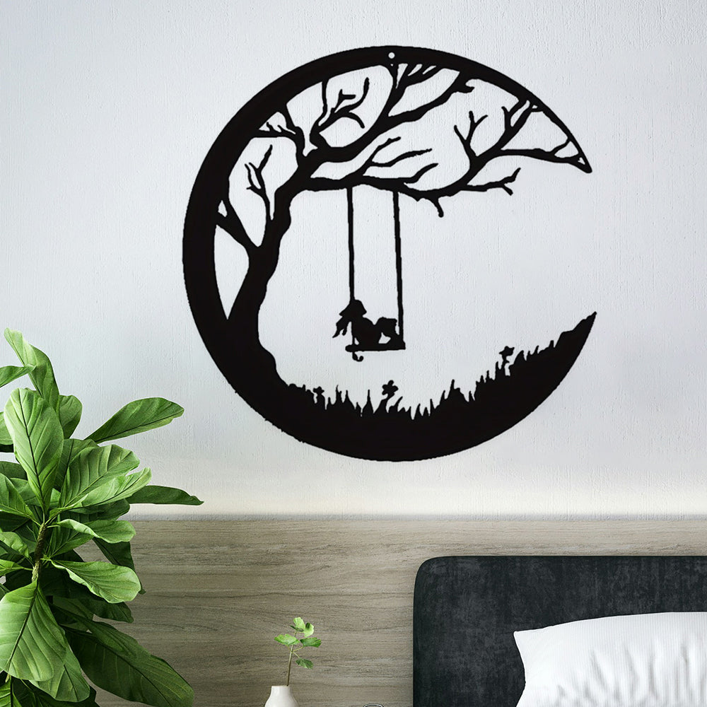 Lune et Arbre de la Pelouse avec Fille sur Balançoire Métal Décoratif Mural